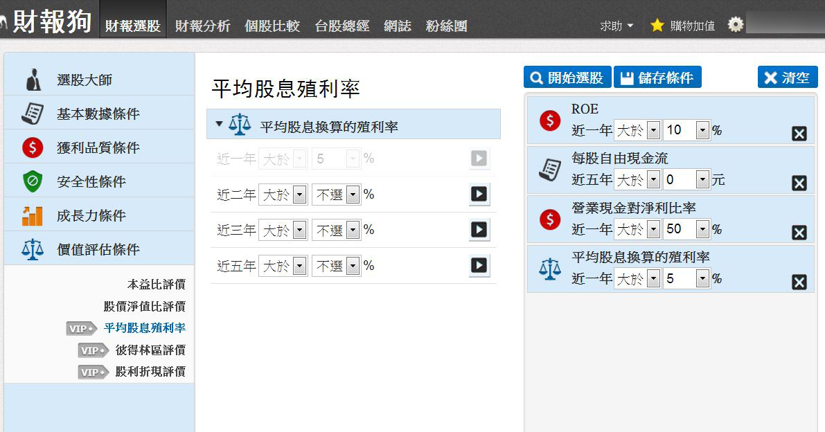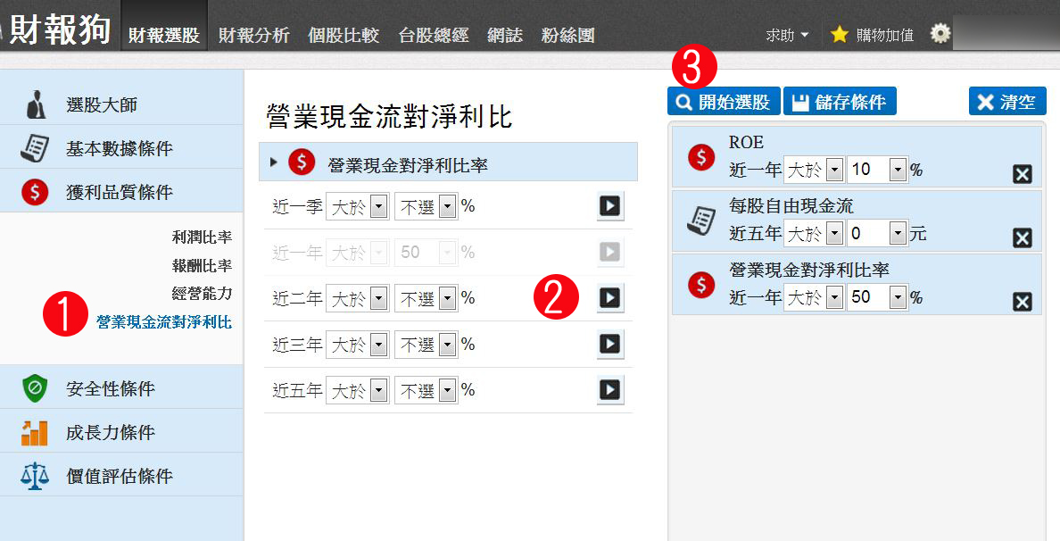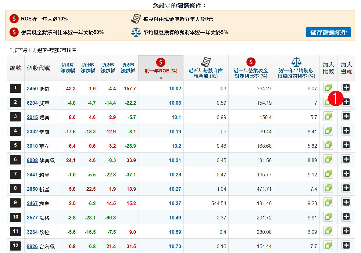 可以找到條件1和條件3,點黑色箭頭可以進到右邊的清單欄,清單裡面的條件也可以修改,例如我們可以把ROE設定為10%
