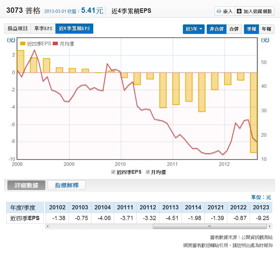 普格的近四季累積EPS都是都是虧損居多,尤其2012第3季最慘。