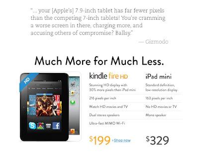 最近的例子是apple推出的ipad mini,尺寸上定位為7.9吋,價格上是329美金。普遍上認定的競爭對手七吋平板的 Nexus 7 與 Kindle Fire HD 的價格都是 $199美金。