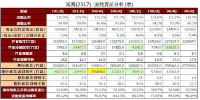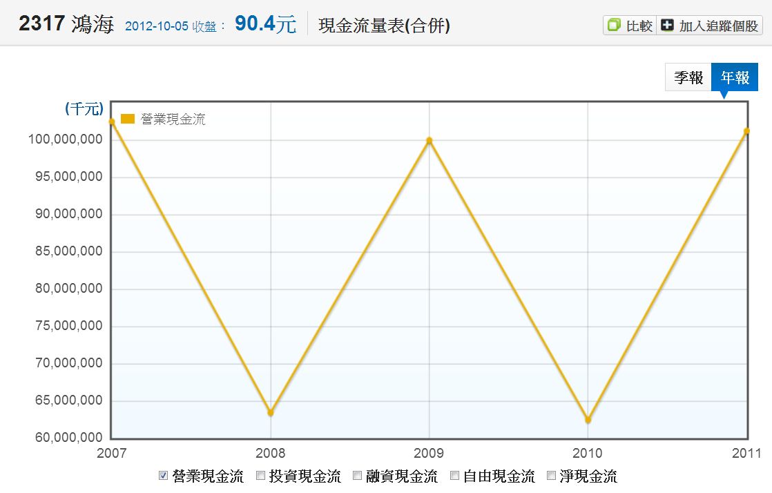 但是鴻海大多數是集團母子公司的金流帳目,因此改用合併報表來看之後,營業現金流立刻轉正。(點圖片可看大圖)