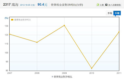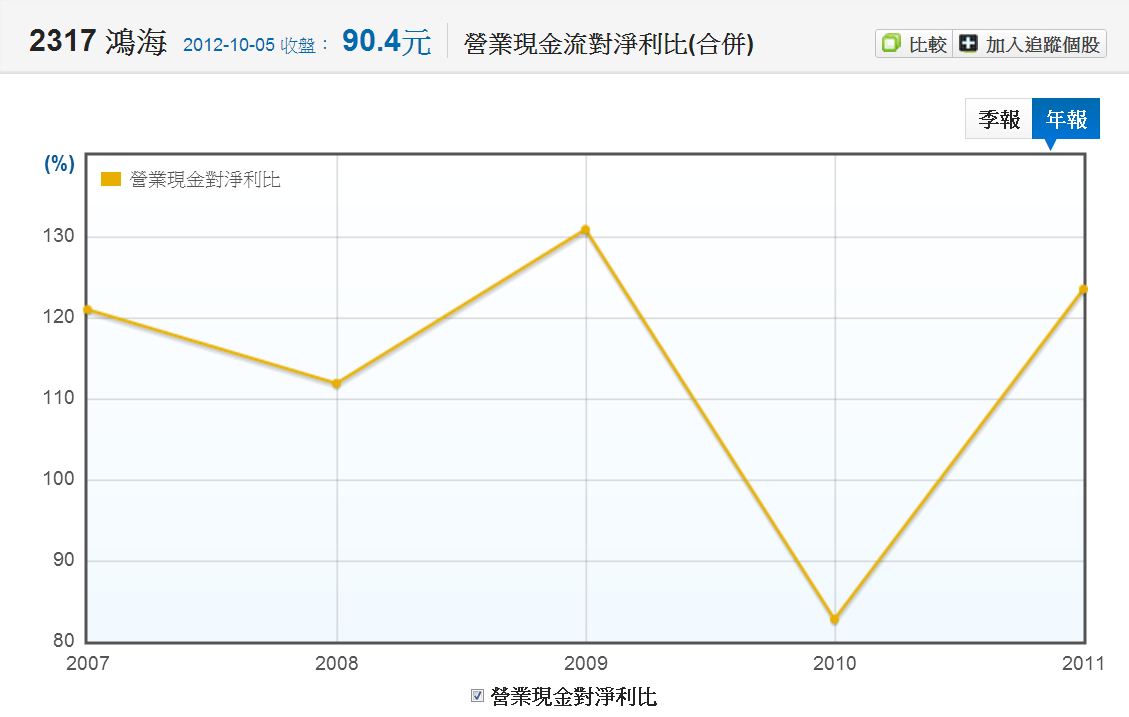 例如我們以非合併報表來看,可以看到2317鴻海在去年2011時盈餘品質指標跌為負
